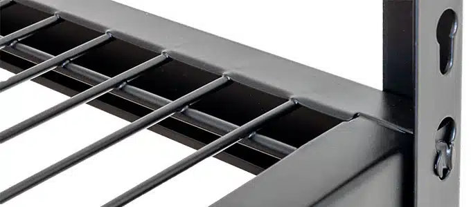 Esta estantería se distingue por su sistema de montaje sin tornillos, que agiliza la instalación. Sus estantes de malla metálica, robustos y duraderos, permiten una carga de hasta 160 kg por nivel, asegurando una sólida capacidad de almacenaje.